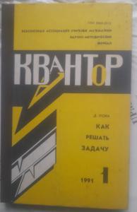 Description: Обычный формат. Журнал Квантор №1/91. Перевод с английского В. Звонаревой и Д. Белла. Под редакцией Ю. Гайдука. В книге известного американского математика Д.Пойа дается психологическо-педагогический анализ проблемы решения математической задачи и предлагается определенная общая методика обучения решению задач. В основе методики Пойа лежит мысль о необходимости привития учащимся наряду с навыками логического рассуждения также прочных навыков эвристического мышления. Книга написана в форме советов-рекомендаций, либо в форме наводящих вопросов, посредством которых учитель может привести в действие и эффективным образом направить усилия ученика, затрудняющегося самостоятельно начать или продолжать решение задачи. Немного загрязнена обложка.